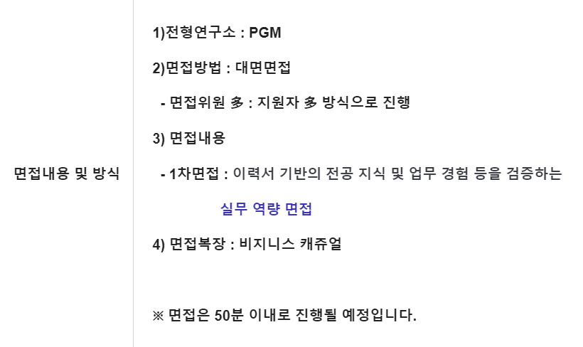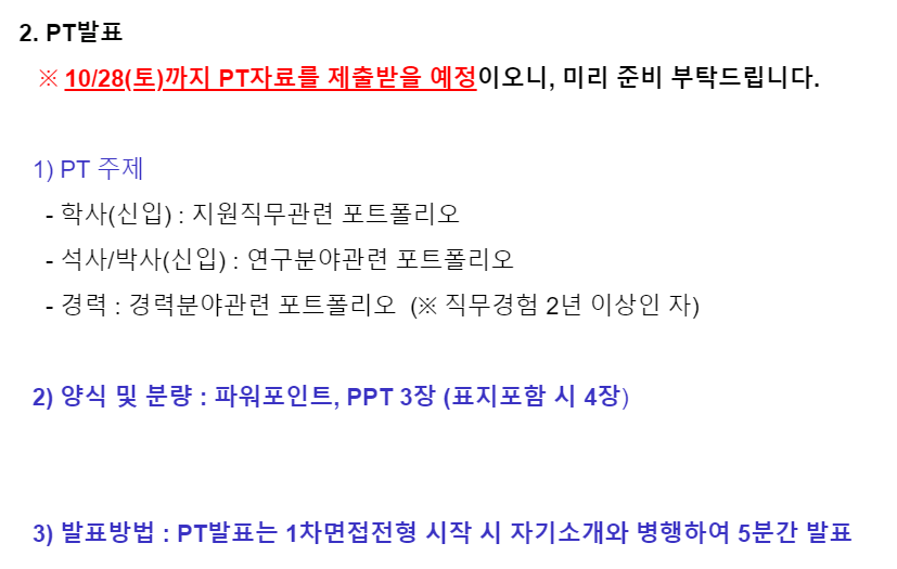 PT 발표를 각각 5분씩 하고 면접을 진행한다.