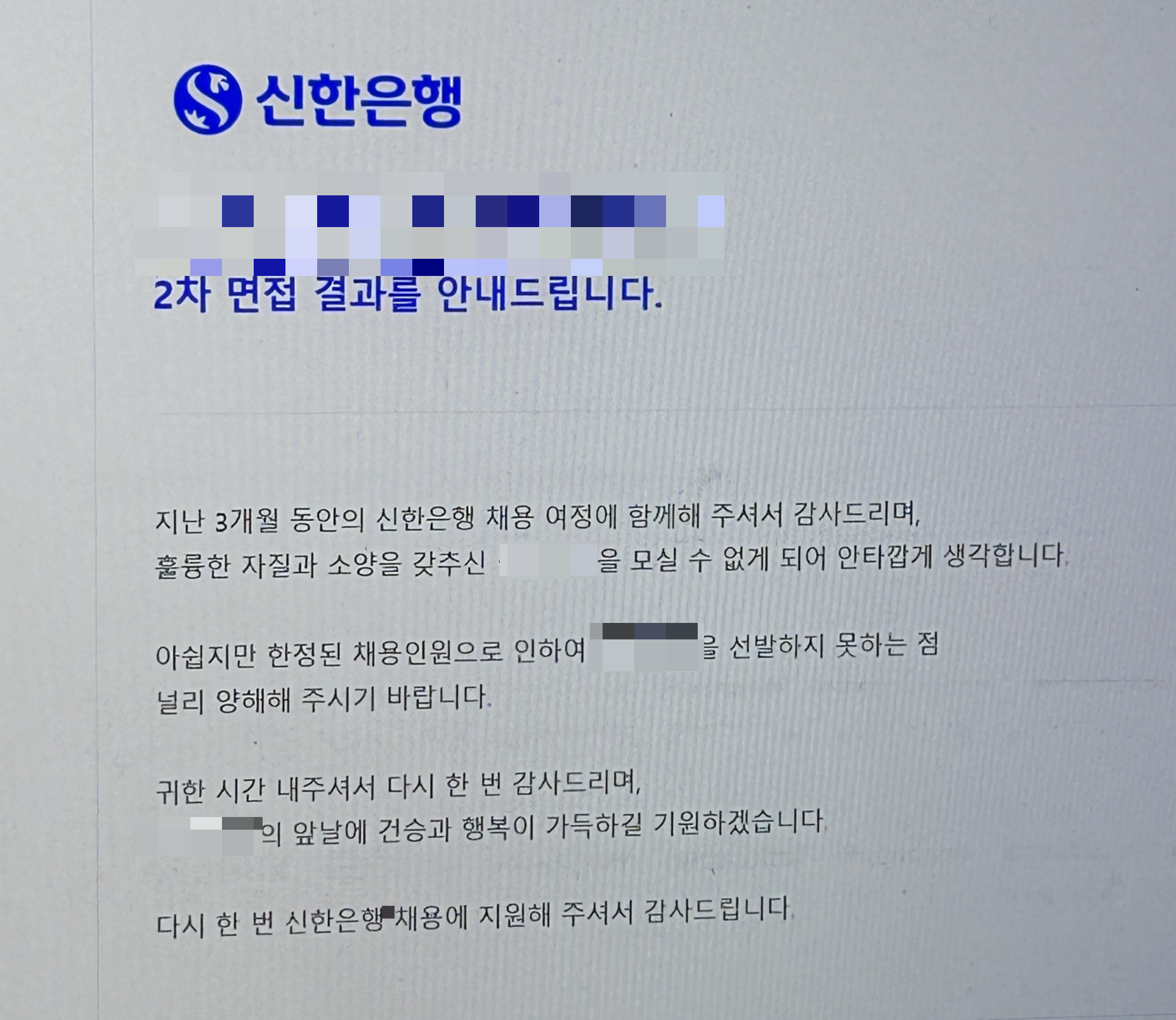 이전글: https://kmyobin.tistory.com/142 [신한은행] 2023년 디지털/ICT 수시채용 서류 합격 후기 (모바일, 웹 서비스 개발 및 운영)나에게 정말 많은 아픔을 줬던 신한은행 채용 후기를 써보려 한다. (ㅠㅠ)