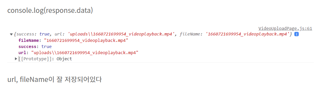 받아온 파일 경로는 Axios.post('/api/video/uploads') 안에, 받아온 지속 시간과 썸네일경로는 Axios.post('/api/video/thumbnail') 안에 작성하였다