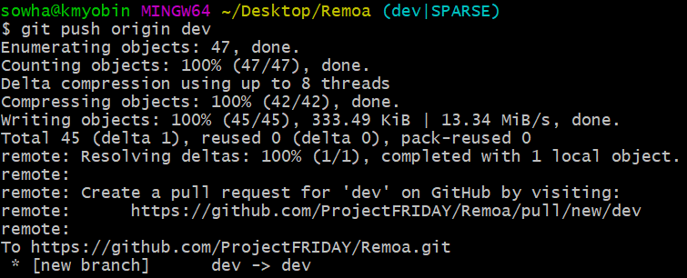git checkout -b "dev"으로 dev branch를 생성해주었다.